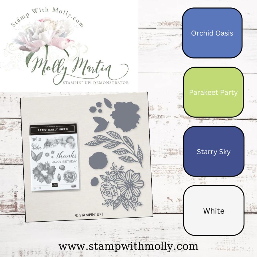 I hope you enjoy the cards I showcase this week with the Artistically Inked Stamp Set and the coordinating Artistic Dies. Today’s card is one of my favorites, using the 2022-2024 In Colors. I love how Orchid Oasis & Starry Sky blend well, making the white stand out in the card.