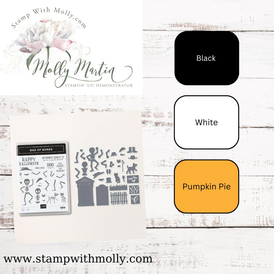 The Base of the Card is Basic Black and has a quarter sheet of Basic White inside, a scrap of Pumpkin Pie and Basic White for the Deckled Circles, and the rest of the card has Them Bones DSP.