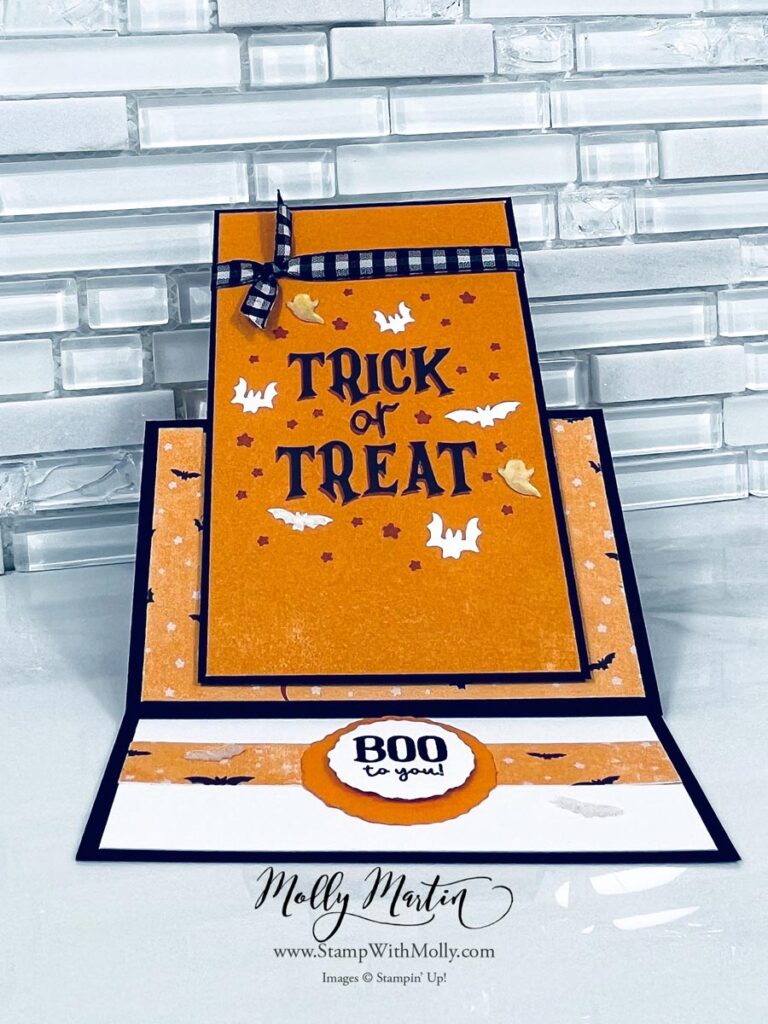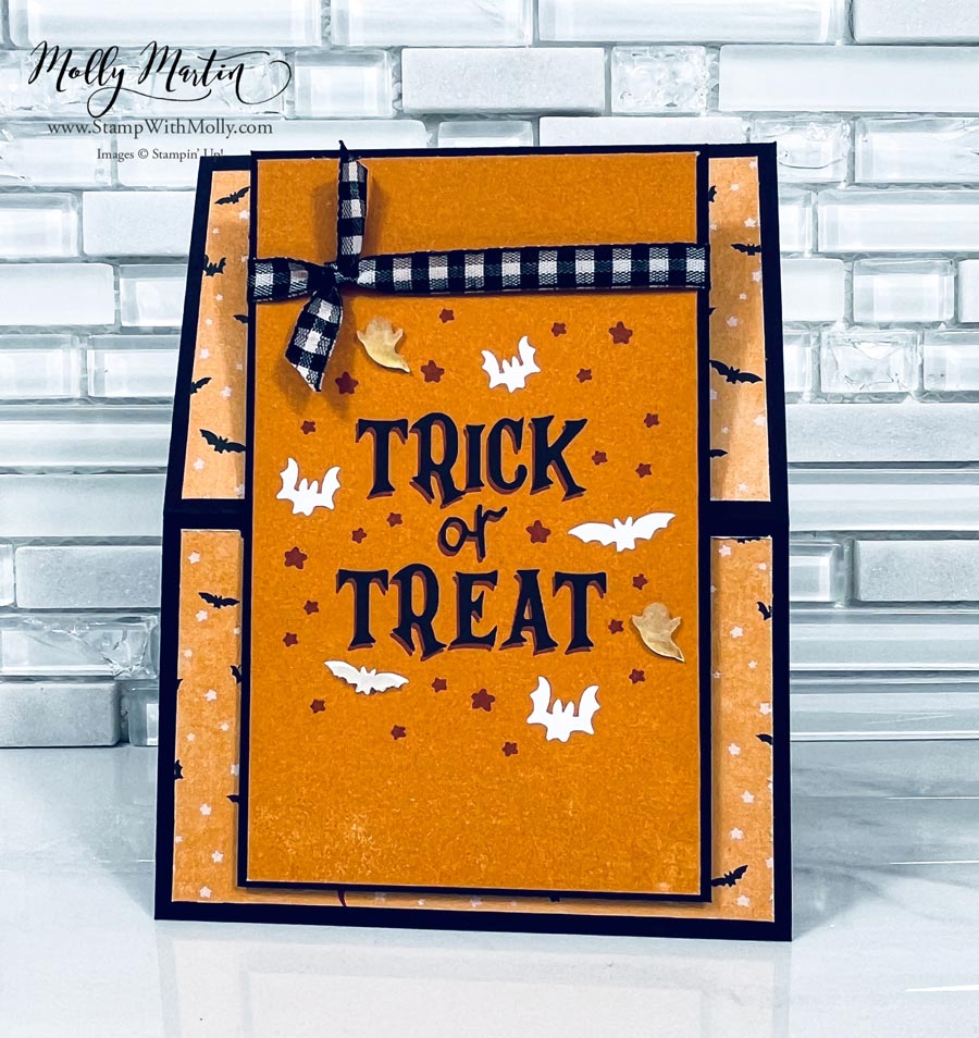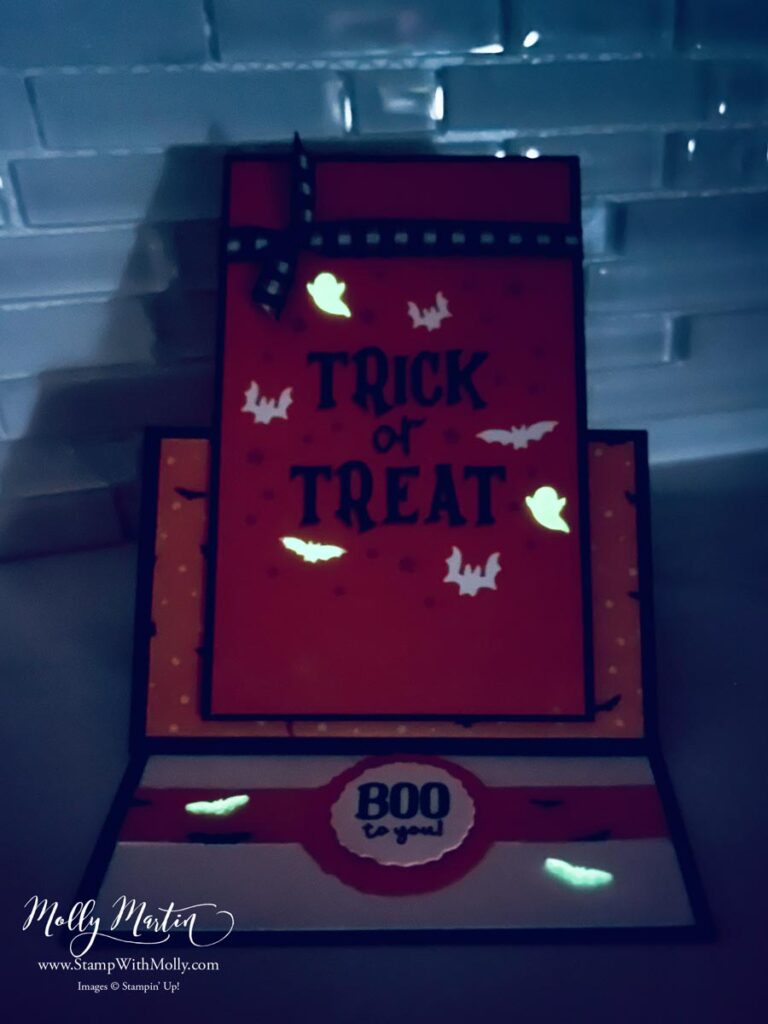 Them Bones DSP from Stampin’ Up! It is so much fun to play with that I made this simple Easel Fun Fold card with it. The card has also been embellished this card with the most adorable Glow-In-The-Dark Bats & Ghosts.