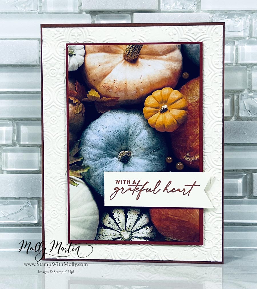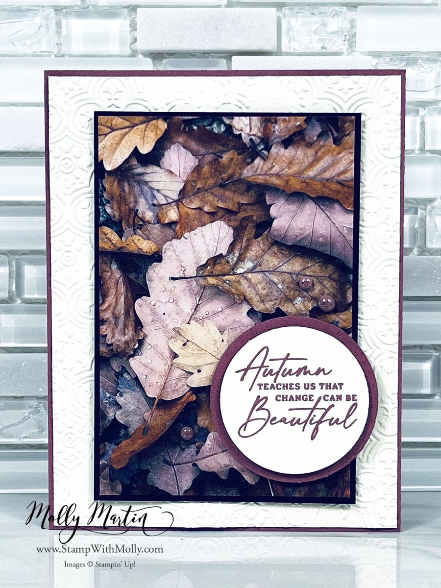 My second favorite item in the All About Autumn Suite is the Distressed Tile 3D Embossing Folder. It gives the card some texture and gives it an avid stamper feel.
