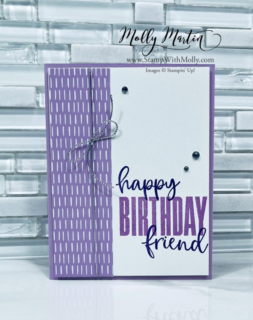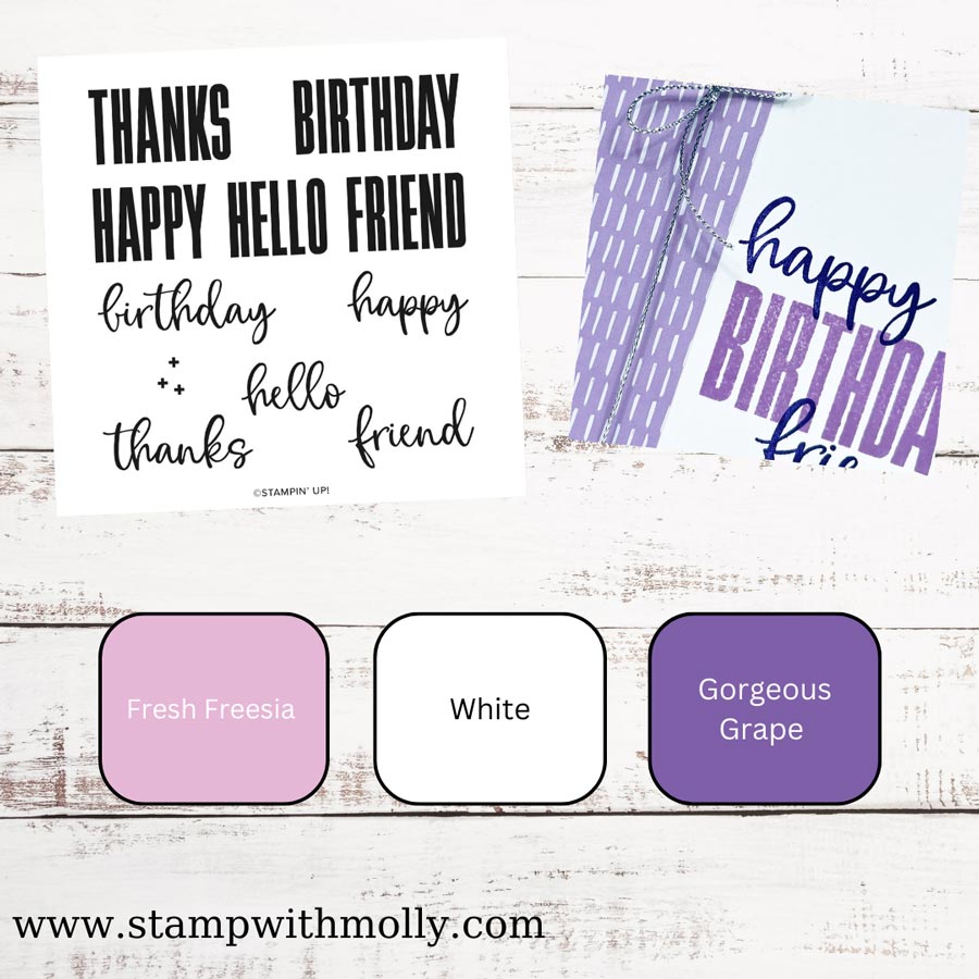 Today’s card uses a returning in-color from 2021-2023 Fresh Freesia. Purples are my favorite color. Adding another shade of purple to the card gives it another level; I used Gorgeous Grape to add additional color. The Basic Rhinestones add bling to the card 😍