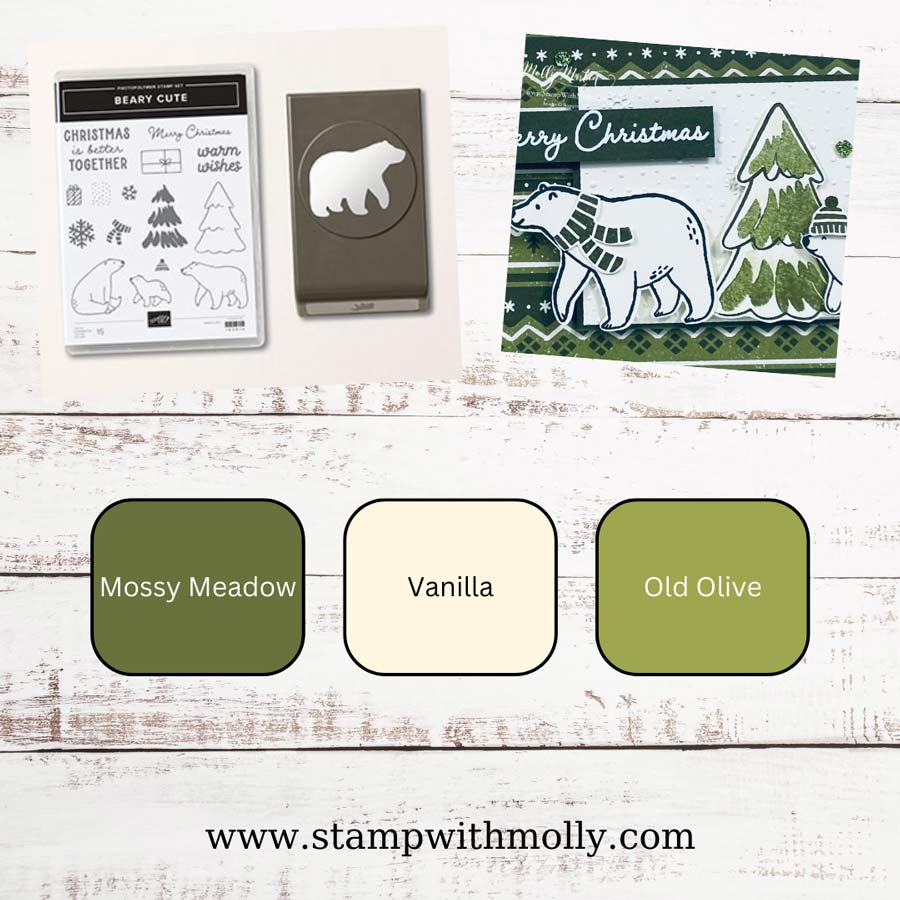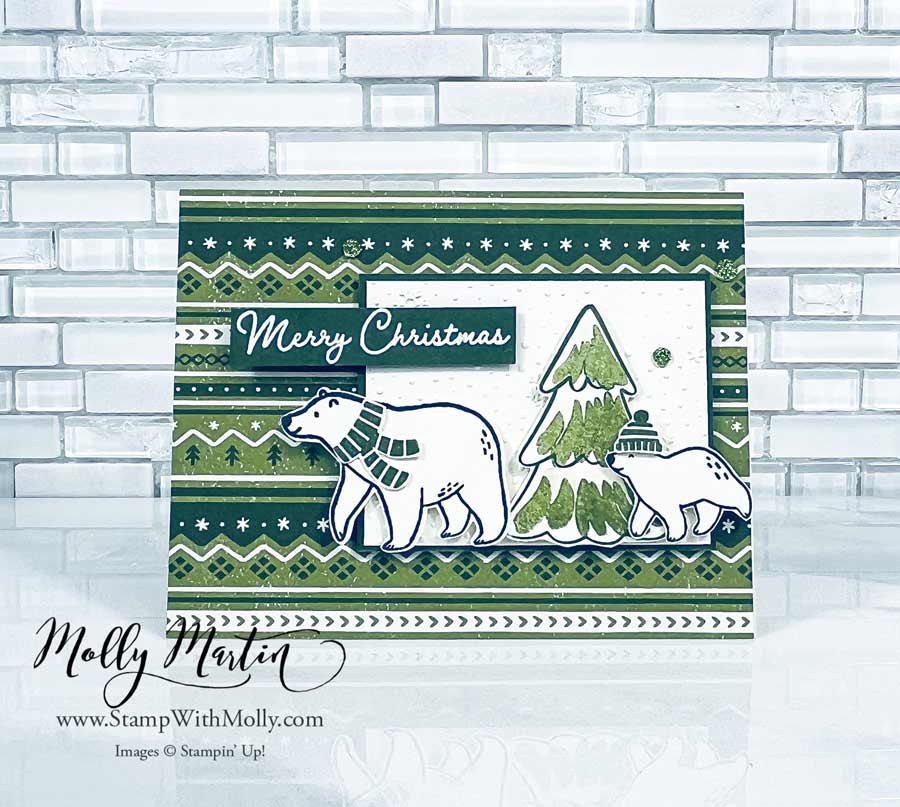 I hope you enjoy this week’s cards as much as I did. How adorable is the little bear following the big bear? I love this paper’s Nordic feel and the greens in it. When I saw it, I knew I would have to create a card using this Designer Series Paper.