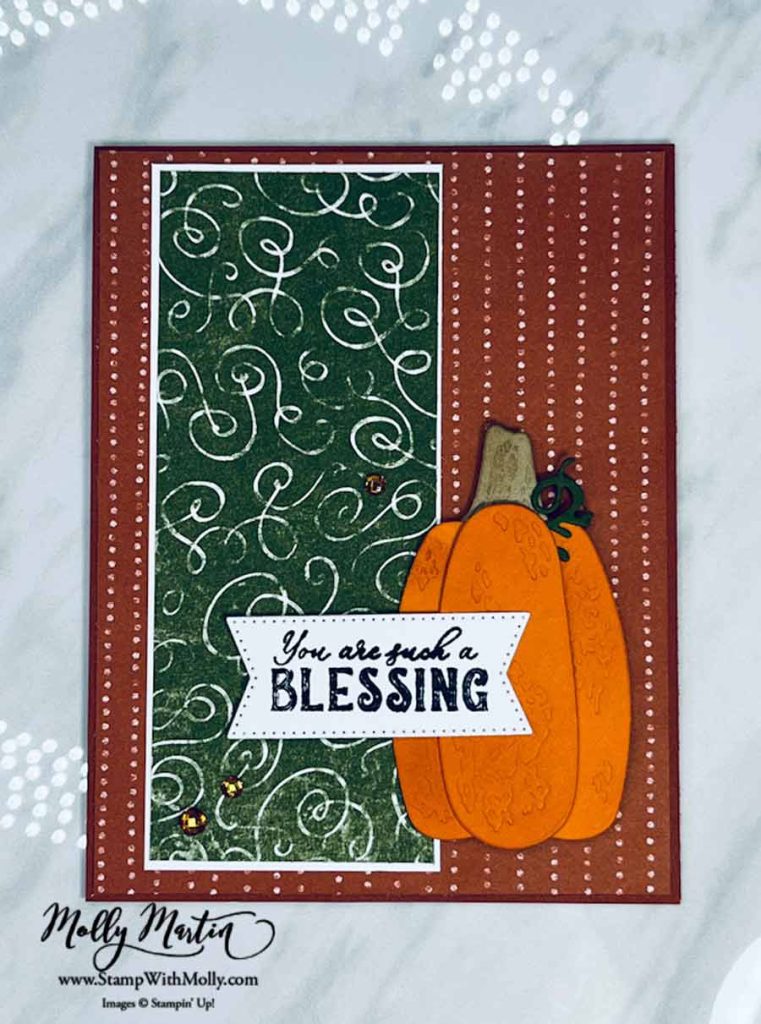 Here is another simple card using the Rustic Harvest Suite. I created this cute pumpkin with Rustic Pumpkin dies; I used the stampin’ blends on the pumpkins to give them a little depth. How cute is adding the Rustic Harvest Designer Series Paper? I love how adding different layers just makes the card look.