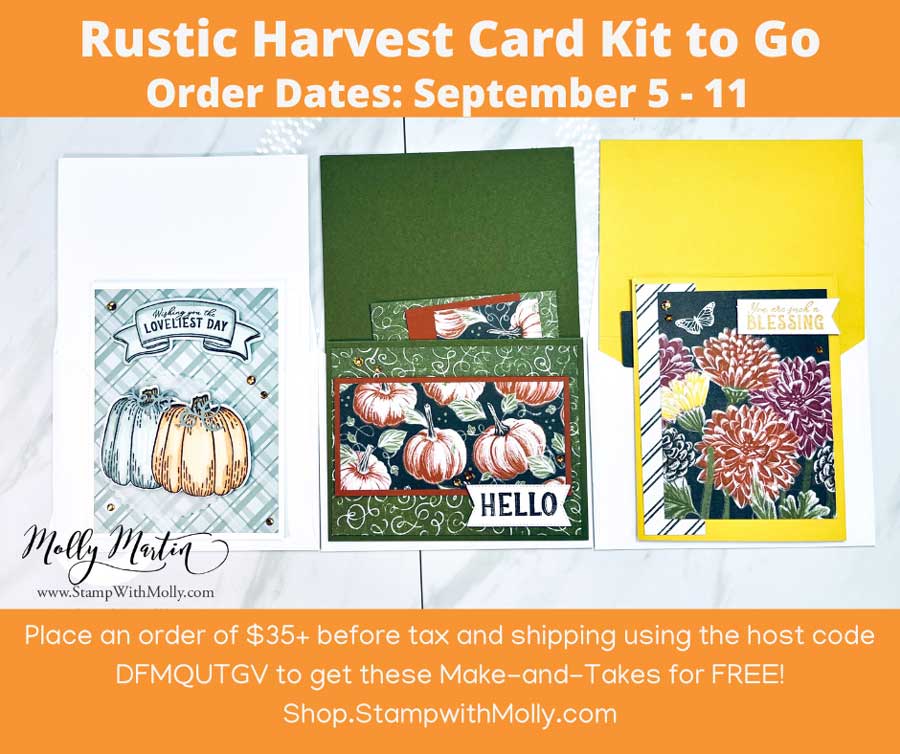 For this week’s projects, you’ll need the Rustic Harvest Stamp Set, inks, markers, and adhesives to complete the projects (see recommended items below). I don’t send any pre-stamped images per the Stampin’ Up! policy. You can substitute the items listed for supplies you already own as well.