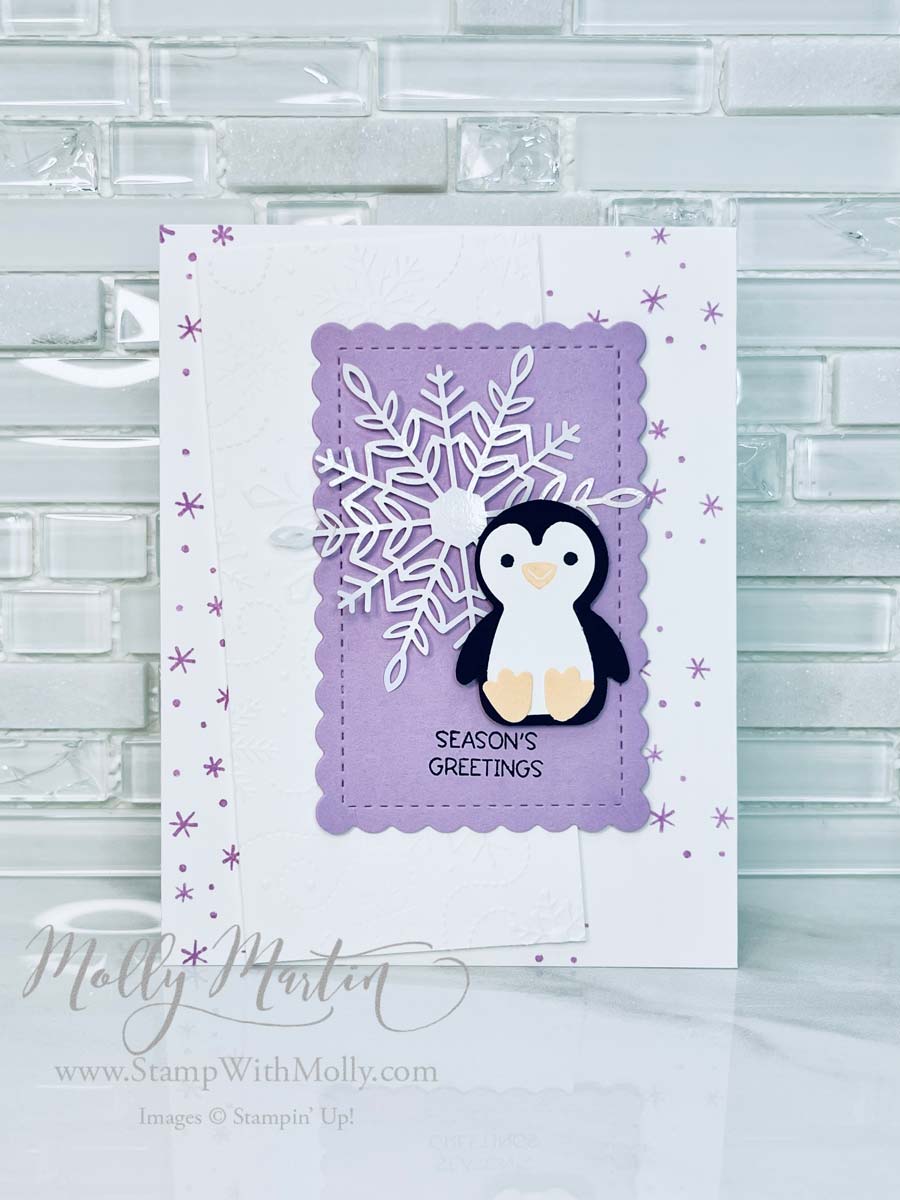 This week I am featuring Stampin’ Up! The Penguin Place Stamp Set & Penguin Punch. Today’s card is one I created using items from the card kit to go!