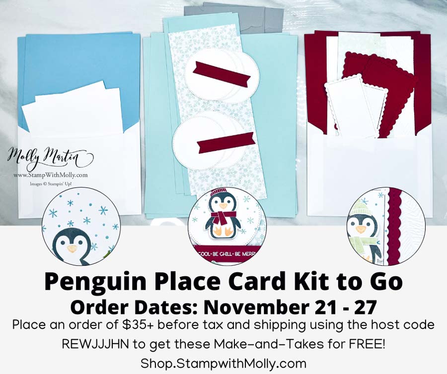 For this week’s projects, you’ll need the Penguin Place Stamp Set and Penguin Builder Punch, inks, and adhesives to complete the projects (see recommended items below). I don’t send any pre-stamped images per the Stampin’ Up! policy. Please feel free to substitute the items listed for supplies you already own.