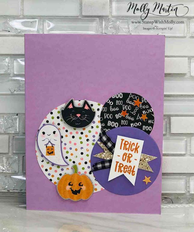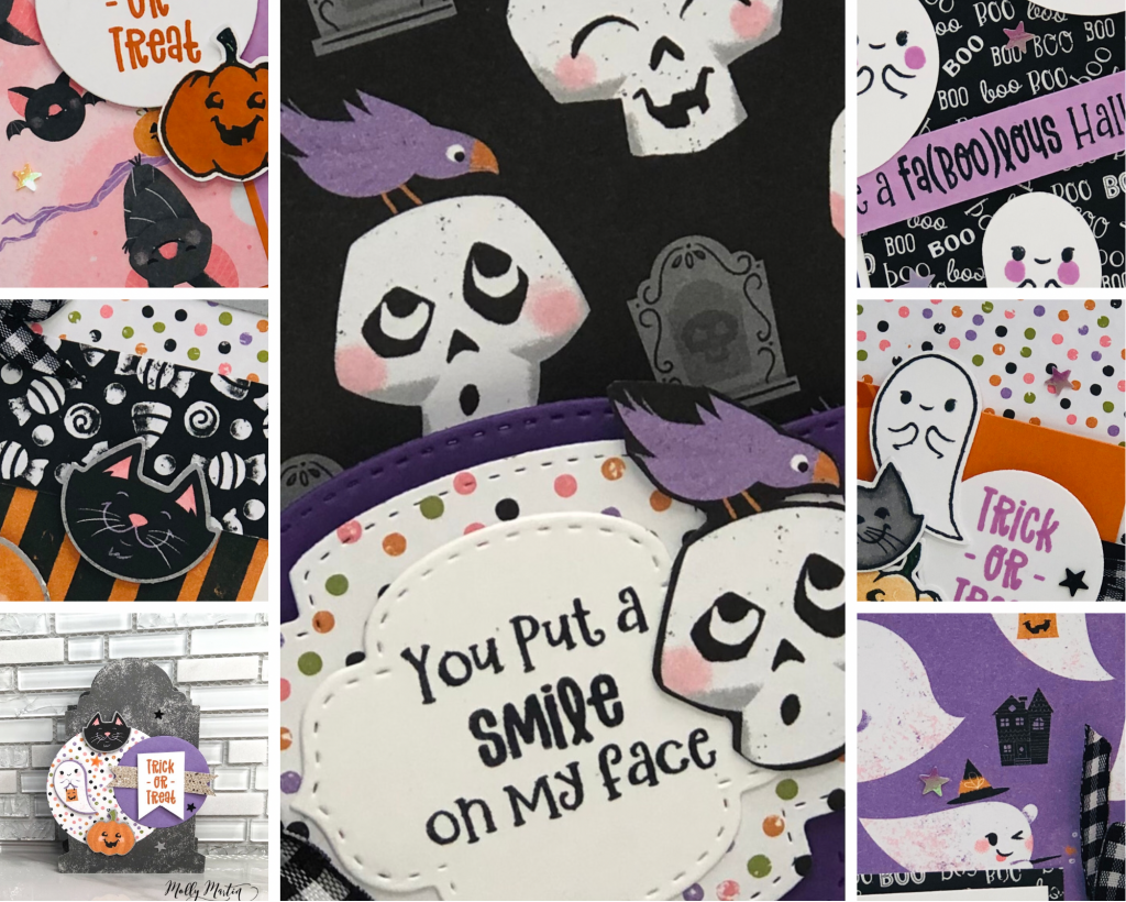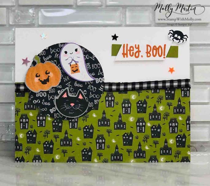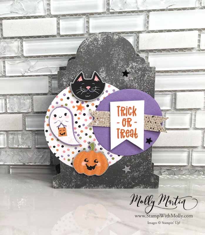 The suite includes these adorable tombstone treat boxes. Along with coordinating 6 x 6 Designer series paper, black and white gingham ribbon, cute stars adhesive-backed sequins, & the cute stamp set with coordinating punch. I was able to create so many cards and projects with this suite, my creativity just exploded.