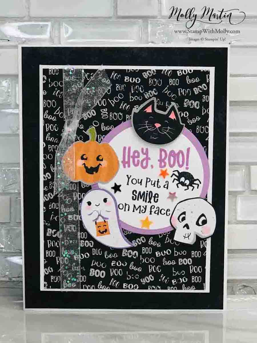 The suite includes these adorable tombstone treat boxes. Along with coordinating 6 x 6 Designer series paper, black and white gingham ribbon, cute stars adhesive-backed sequins, & the cute stamp set with coordinating punch. I was able to create so many cards and projects with this suite, my creativity just exploded.